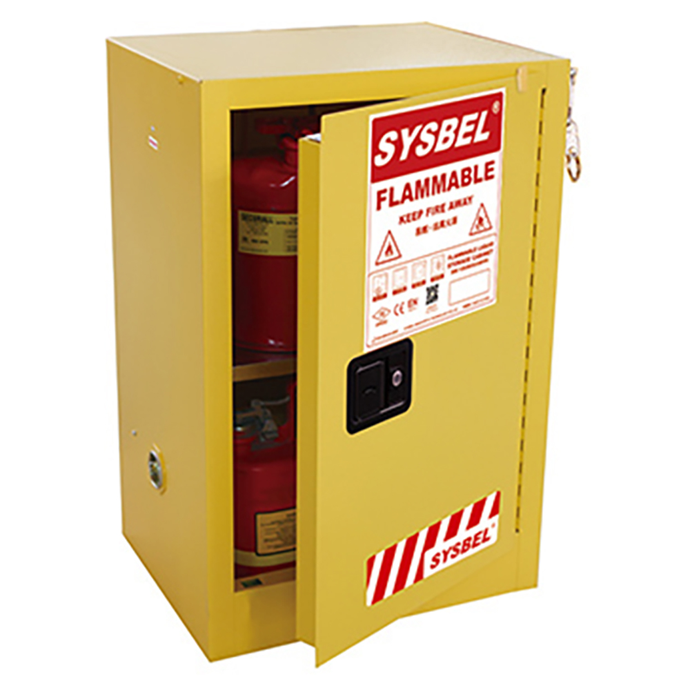 SYSBEL’s high-quality flammable liquid safety cabinet features doublelayer 18 Ga (1.2-mm) steel plates spot-welded with a 38mm separation,